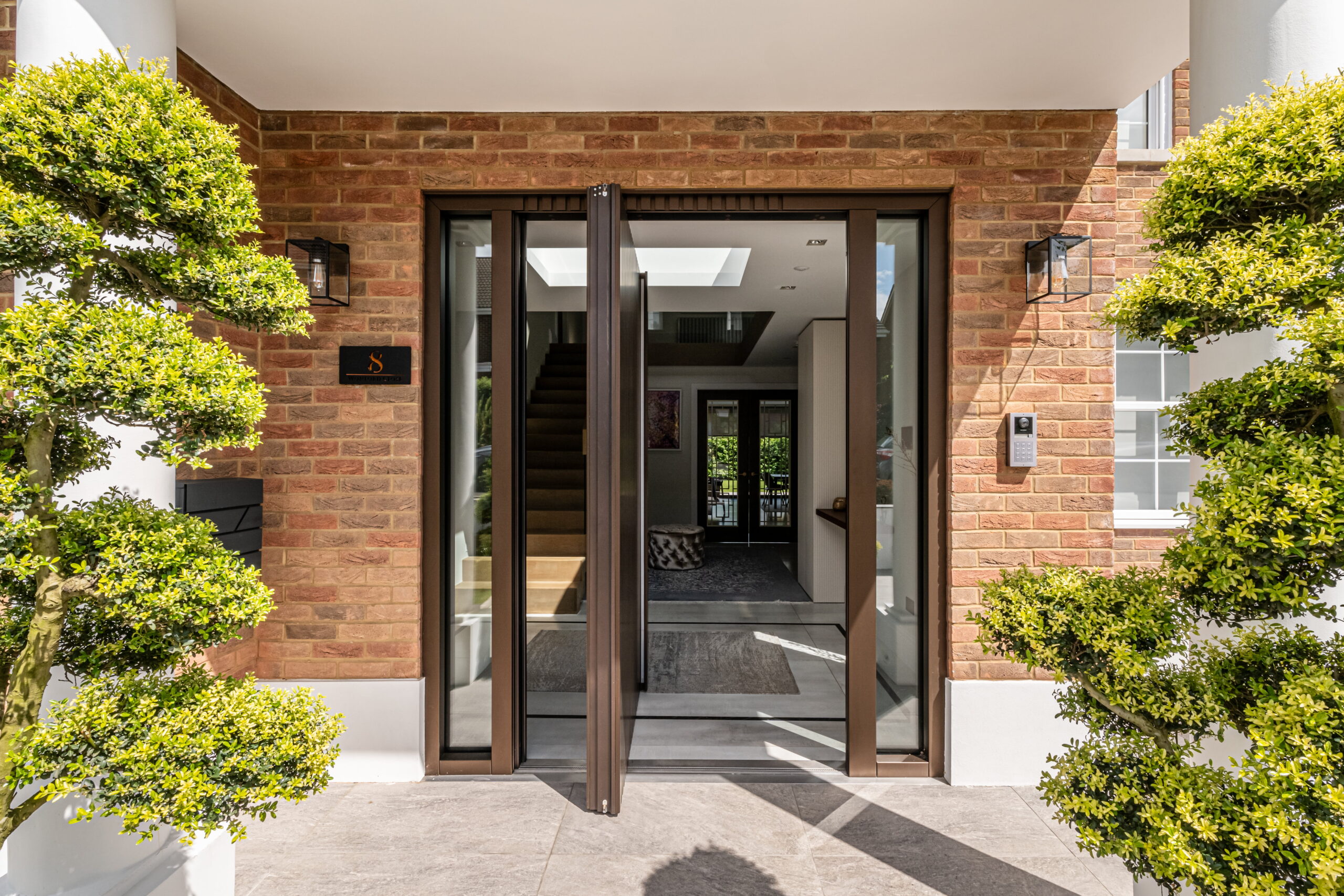 - Solid wood or wood‑look pivot doors for warmth and a dramatic, oversized statement entry.
